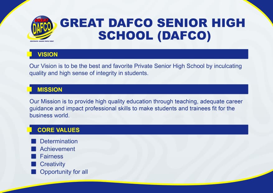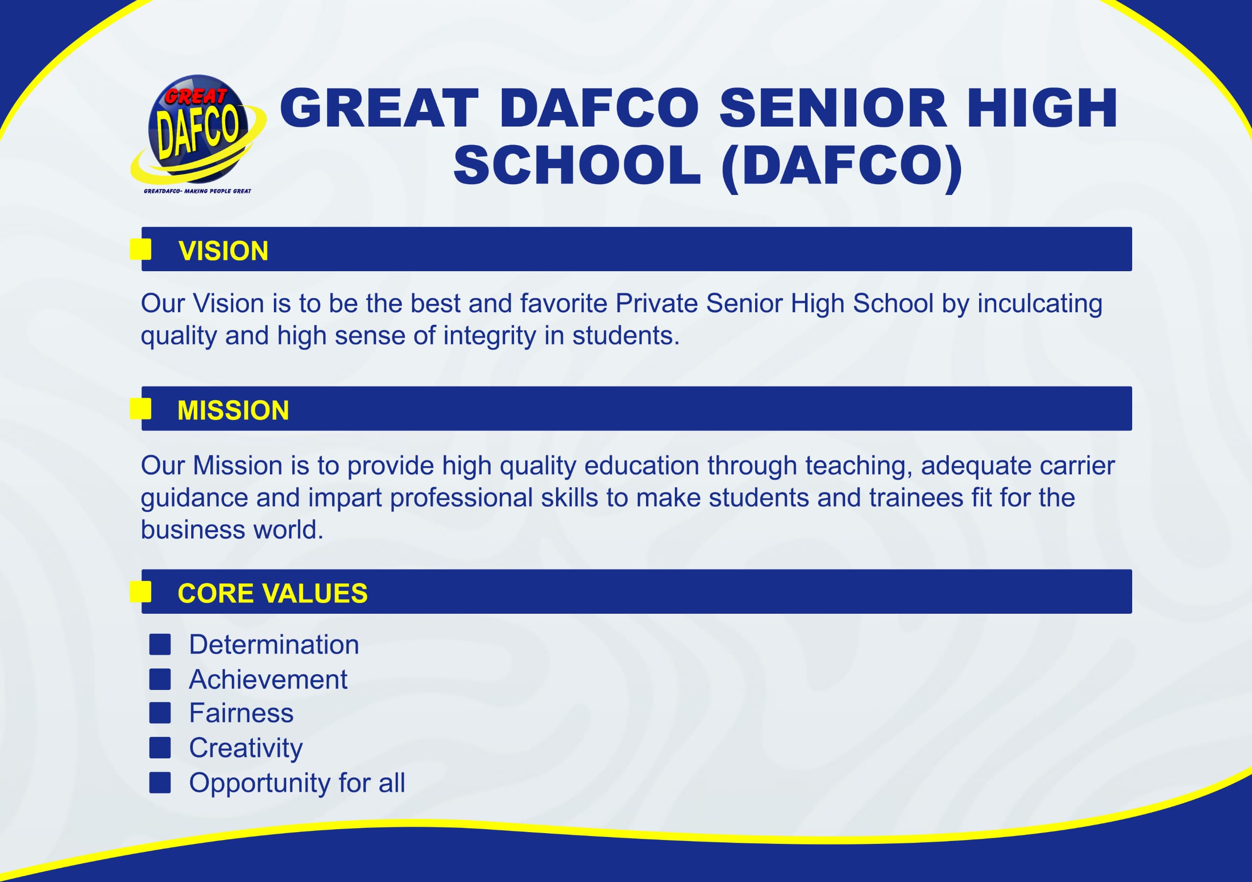 Our Vision is to be the best and favorite Private Senior High School by inculcating quality and high sense of integrity in students.